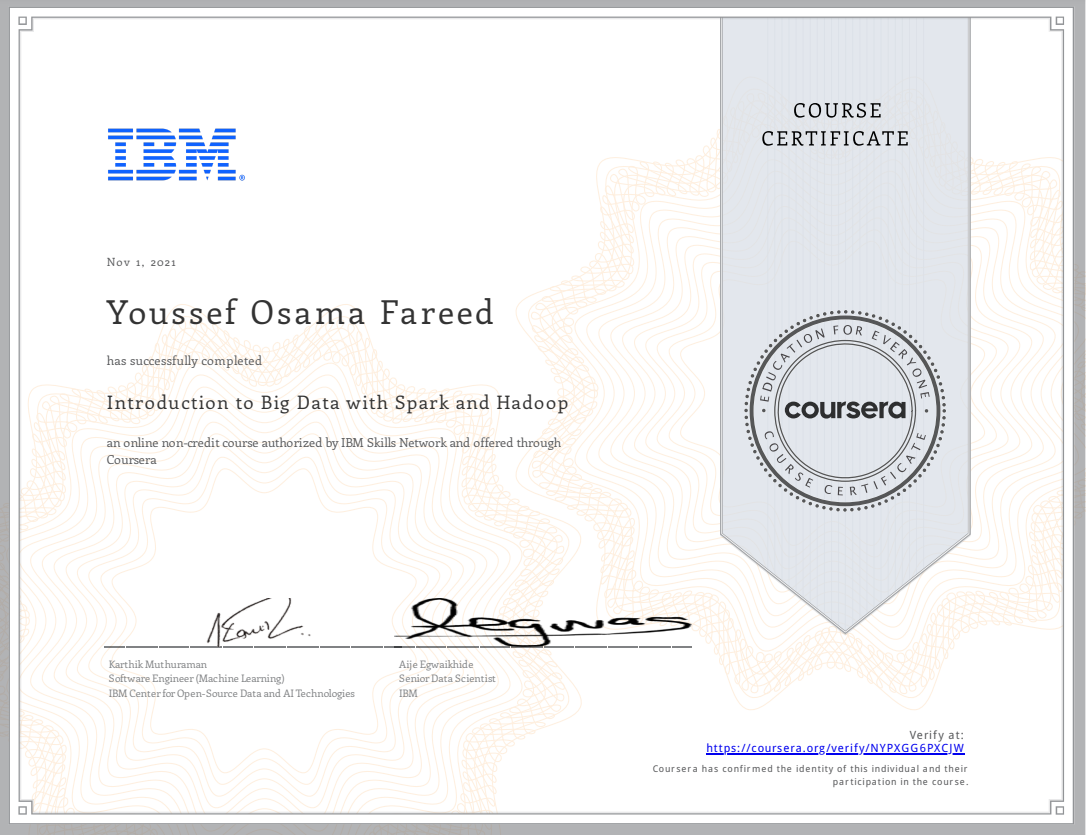 Article Article Apache Hadoop SparkSQL SparkML Big Data Apache SparkView "Introduction to Big Data with Spark and Hadoop" Certificate